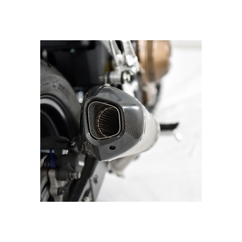 Der Endtopf verfügt über eine innere Struktur aus Edelstahl und eine konische Hülle aus Titan. Das Endstück besteht aus Aluminium mit Carbon-Finish im hexagonalen Design.