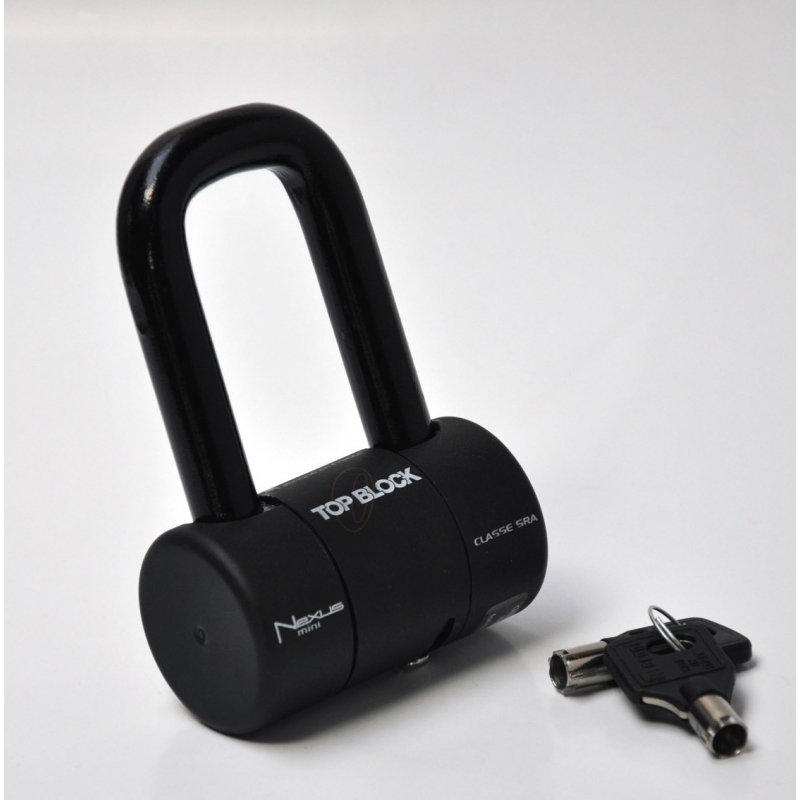 Premium Bremsscheibenschloss in U-Form, hergestellt in Frankreich von Top Block. Dank seiner geringen Abmessungen lässt es sich leicht unter einem Sattel verstauen. SRA-Klasse, wird mit zwei Schlüsseln und einer Aufbewahrungstasche geliefert.