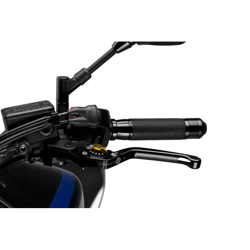 Sporty and ergonomic design made from CNC-machined aluminum, available in various styles (short, folding, extendable) and colors for both the lever and the 6-position adjustment dial (blue, red, black, orange, gold, silver).