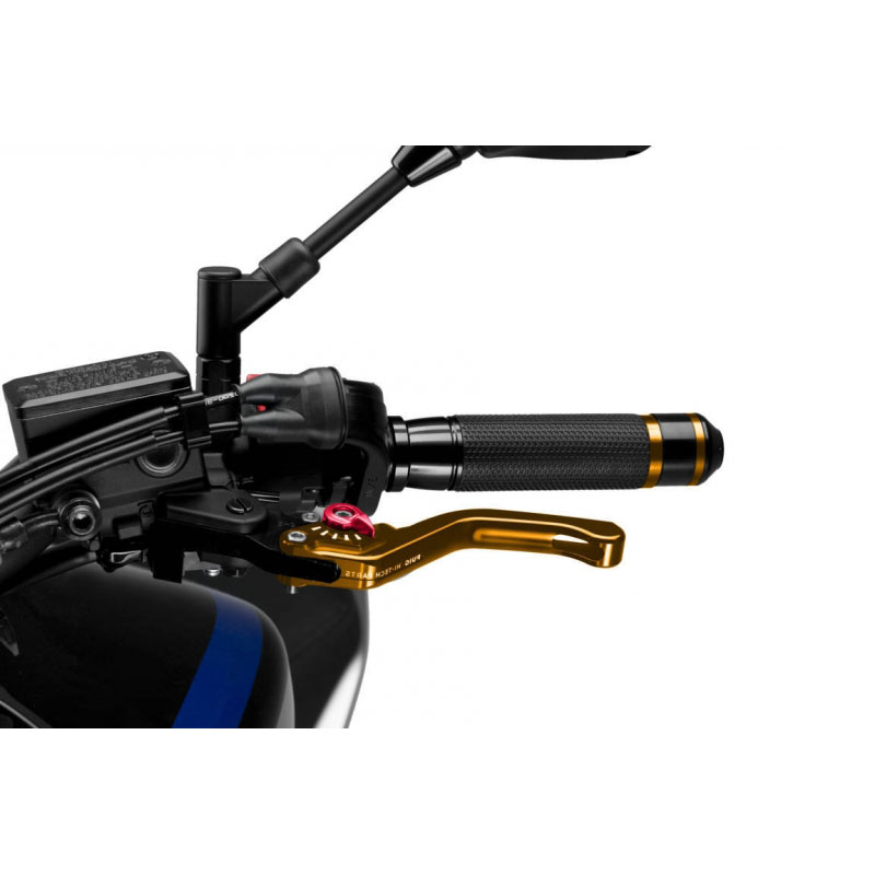 Diseño deportivo y ergonómico en aluminio mecanizado con varias formas (corta, plegable, extensible) y colores a elección para la maneta y la rueda de ajuste de 6 posiciones (azul, rojo, negro, naranja, oro, plata).