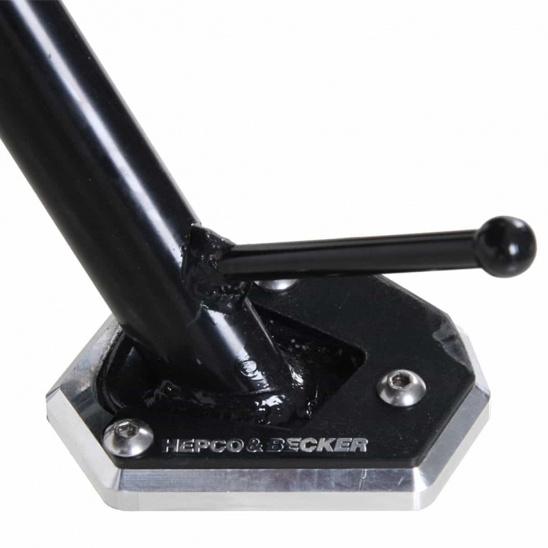 Con su superficie de apoyo ampliada y su fabricación en aluminio, esta base te asegura un soporte óptimo en cualquier condición. Además, sus ranuras facilitan el uso del caballete incluso cuando llevas botas de moto.