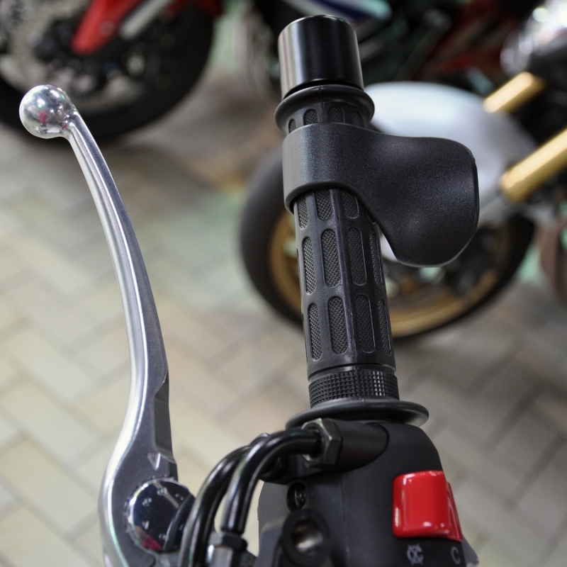 Questa piccola leva si monta sulla manopola dell'acceleratore della tua moto e funge da regolatore manuale per mantenere la velocità senza fatica durante i lunghi viaggi.